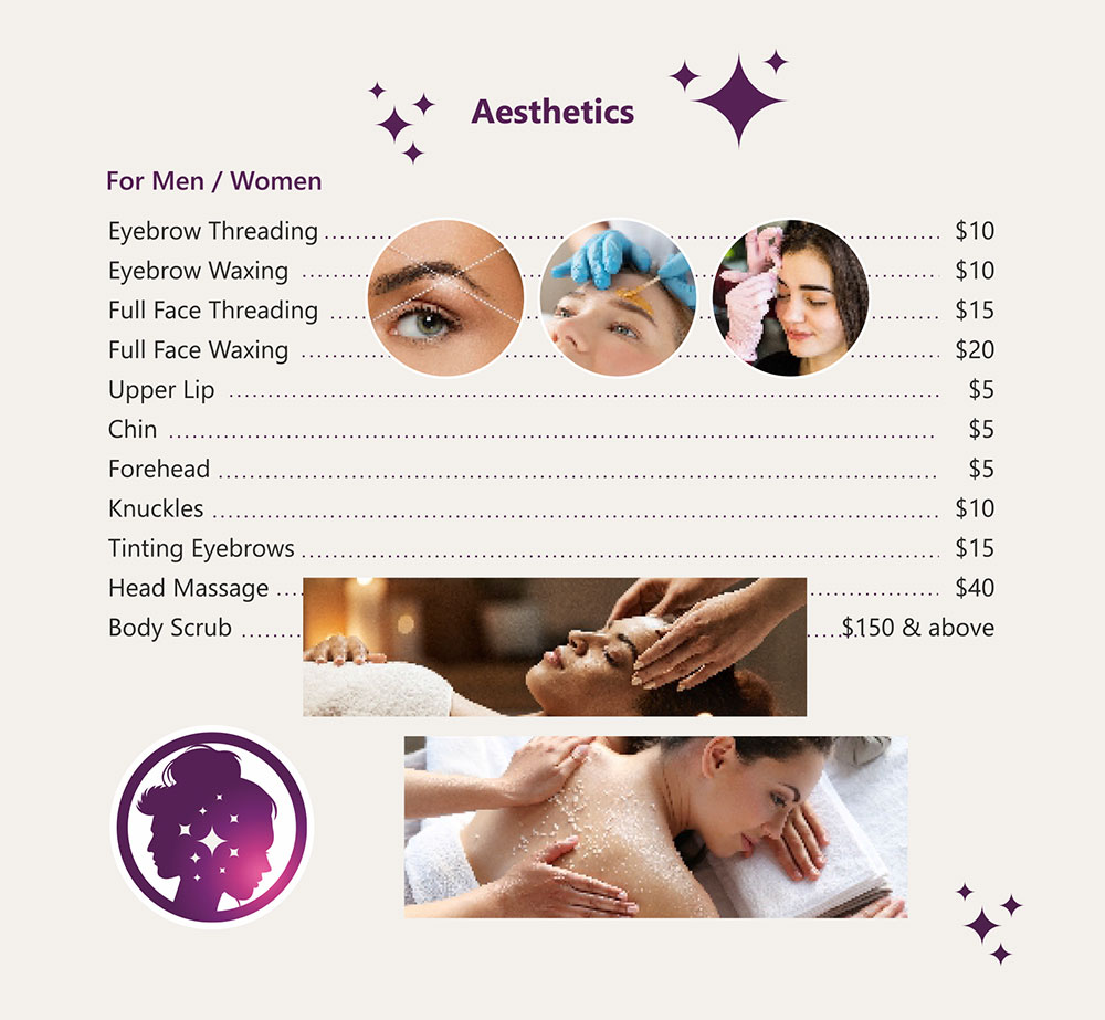 Elevate your beauty routine with our comprehensive aesthetic services. Perfectly shaped brows with stunning precision, smooth flawless looks tailored to your needs are just a few of our specialties. Explore our range of expert aesthetic services including full-face or eyebrow threading and waxing, detailed upper lip, chin and forehead grooming, knuckle care to enhance your natural beauty and leave you feeling pampered and radiant. You can also indulge in a relaxing head massage or body scrub to rejuvenate your senses.